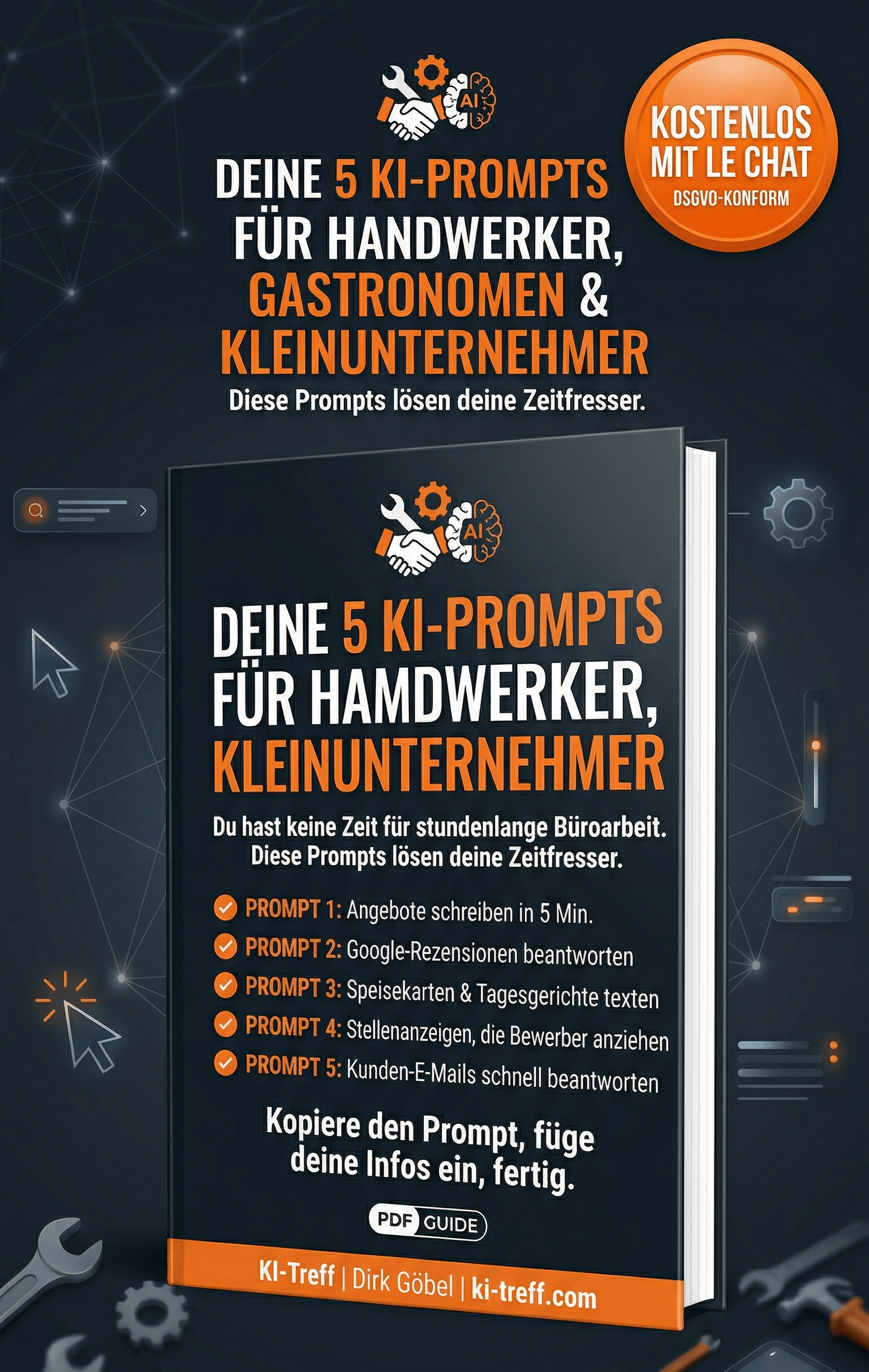 5 KI-Prompts, die ich mit echten Handwerkern und Dienstleistern aus der Region entwickelt habe. Kopieren, einfügen, fertig – in weniger als 5 Minuten. Kein Webinar, kein Pflichtprogramm, kein Technik-Stress.